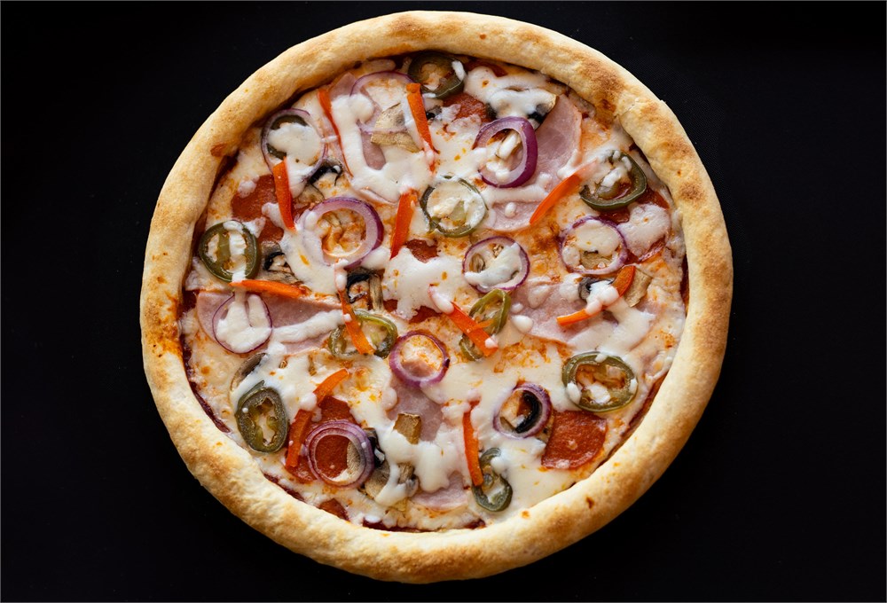 Пепперони, ветчина, моцарелла, пармезан, шампиньоны, паприка, красный лук, халапеньо, пицца - соус.