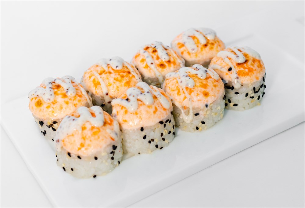 Лосось терияки, омлет, масаго, сливочный сыр, сырный соус унаги, кунжут