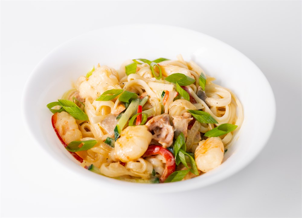 Креветка тигровая, лосось, болгарский перец, огурец, лук репчатый, чеснок, удон, сливочный сыр.