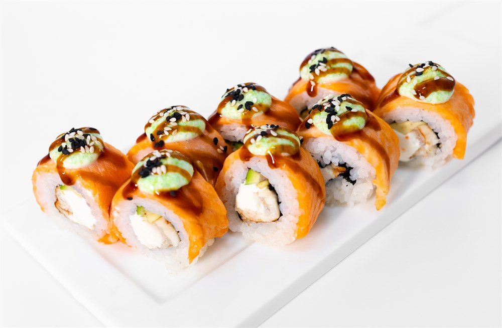 Лосось, угорь, сыр сливочный, авокадо, масаго, яки соус, унаги соус, кунжут, микро зелень