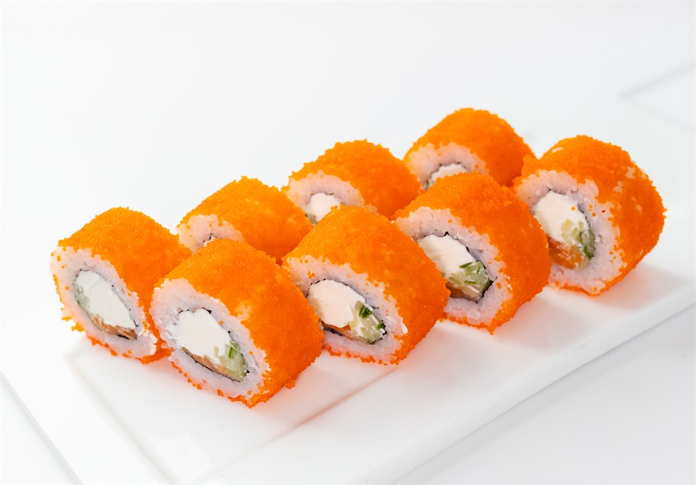 Лосось, угорь, сливочный сыр, авокадо, масаго, унаги соус, кунжут
