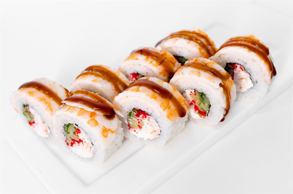 Краб крем, креветка, сливочный сыр, огурец, сыр пармезан, масаго, медовый соу
