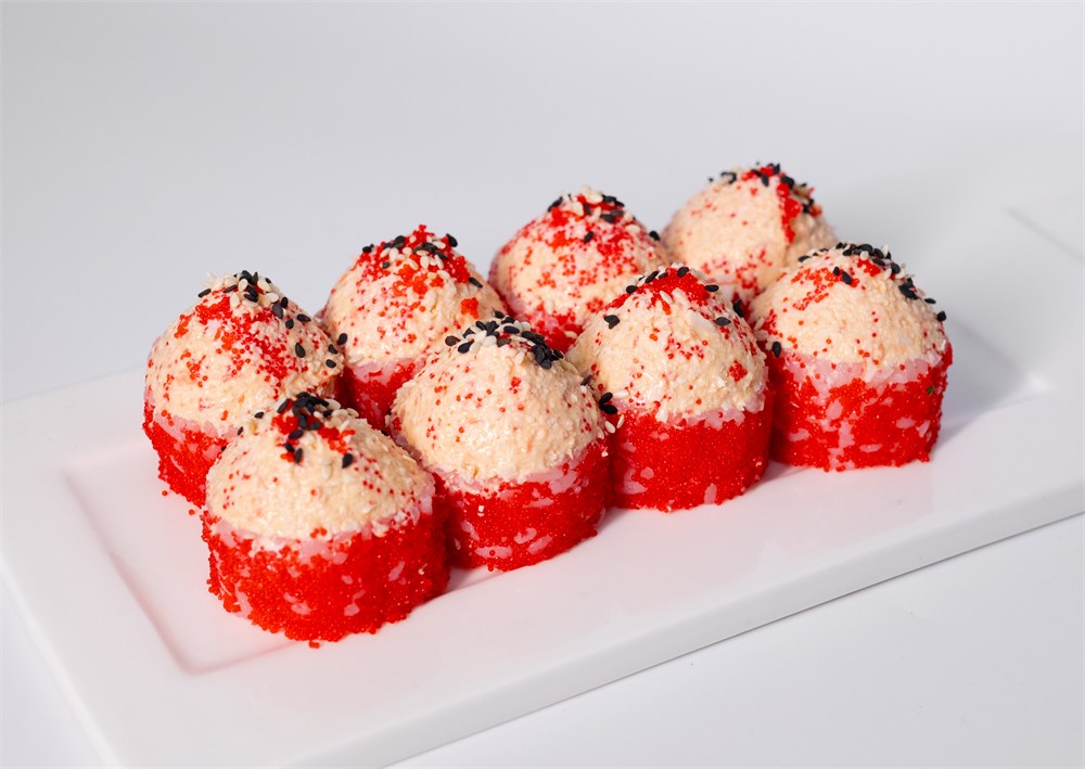 Тигровая креветка, крем краб, сливочный сыр, омлет, болгарский перец, масаго, спайси соус, кунжут