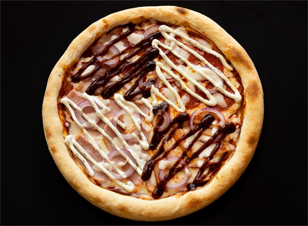Пепперони, ветчина, цыпленок копченный, бекон, моцарелла, пармезан, красный лук, пицца - соус, сливочно - часночный соус, барбекю соус.