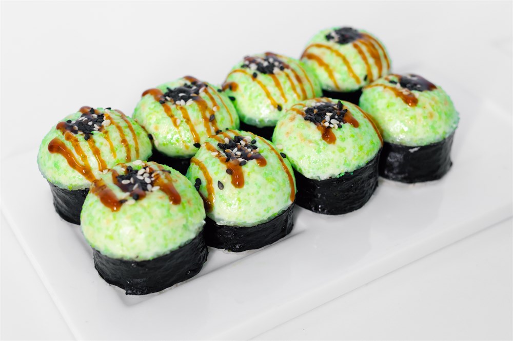 Креветка, сливочный соус, масаго, кунжут, яки соус, унаги соус.