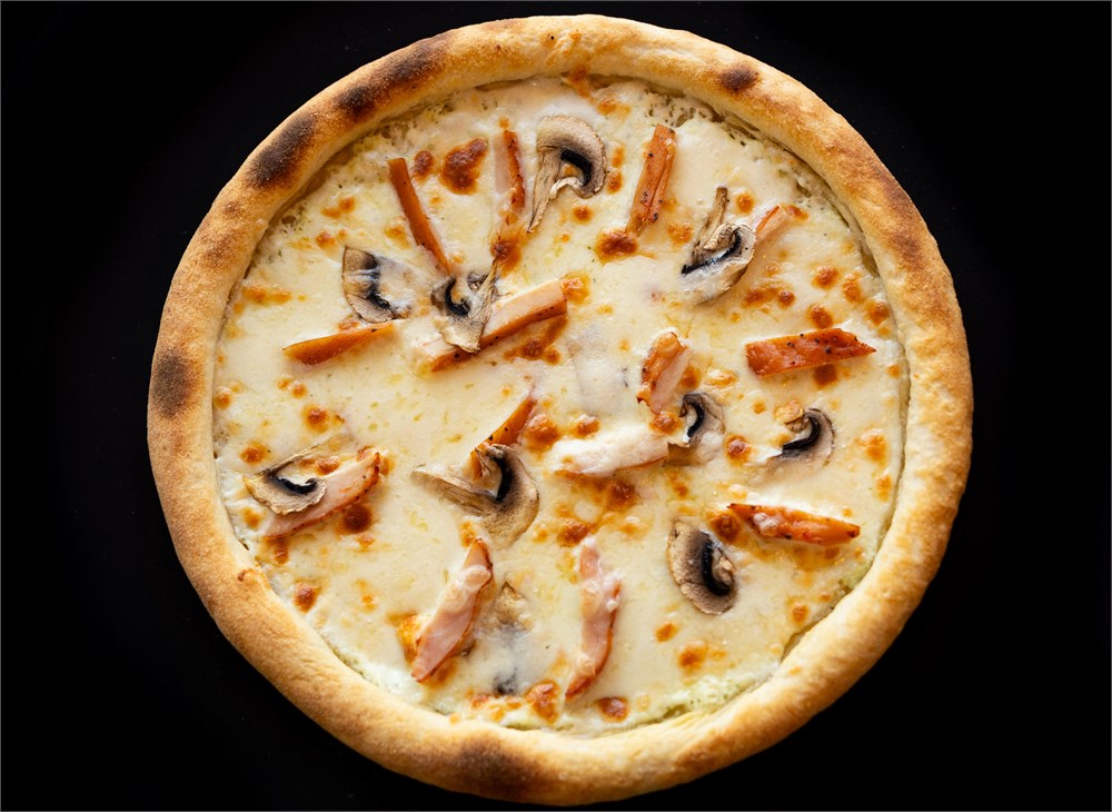 шампиньоны, сулугуни, пармезан, мацарелла, сливочно - часночный соус, ципленок копченный.