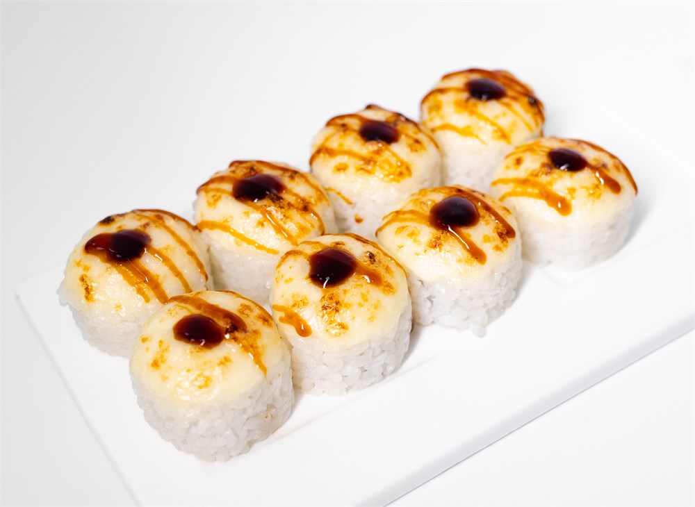 Креветка тигровая, лосось, сливочный сыр, омлет, масаго, кунжут, яки соус, унаги соус.