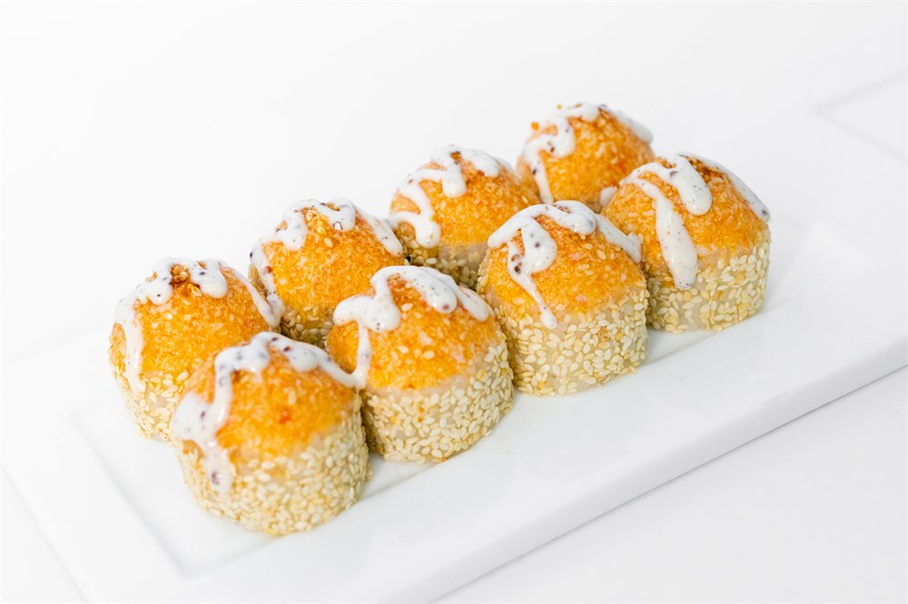 Цыпленок, сливочный сыр, болгарский перец, масаго, огурец, сырный соус, медовый соус, спасйси соус, кунжут.