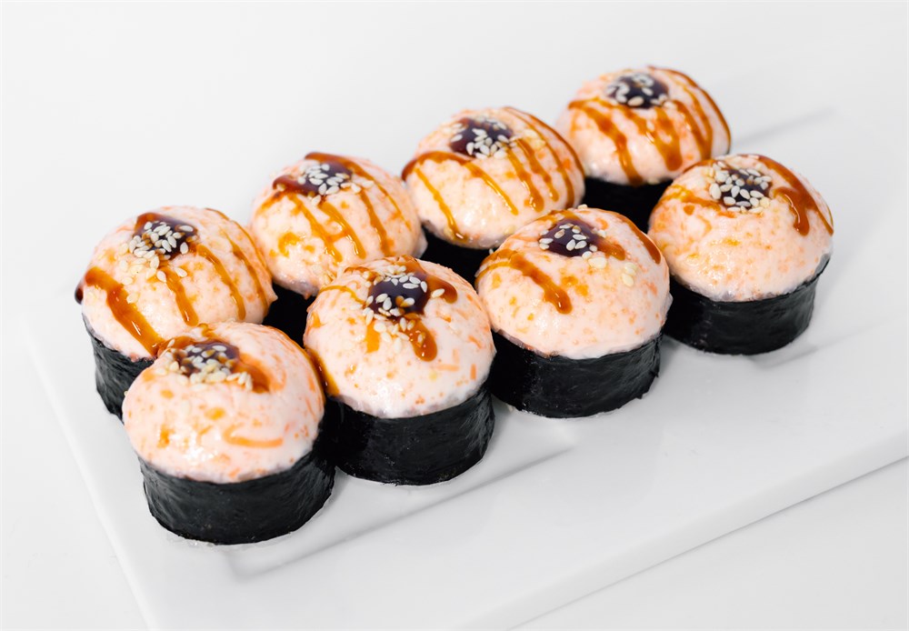 Крем краб, креветка, сливочный сыр, масаго, огурец, кунжут, медовый соус, азиатский соус.