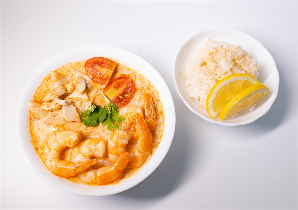 Креветка тигровая, сливки, шампиньоны, томаты черри, кинза, бульон том ям.