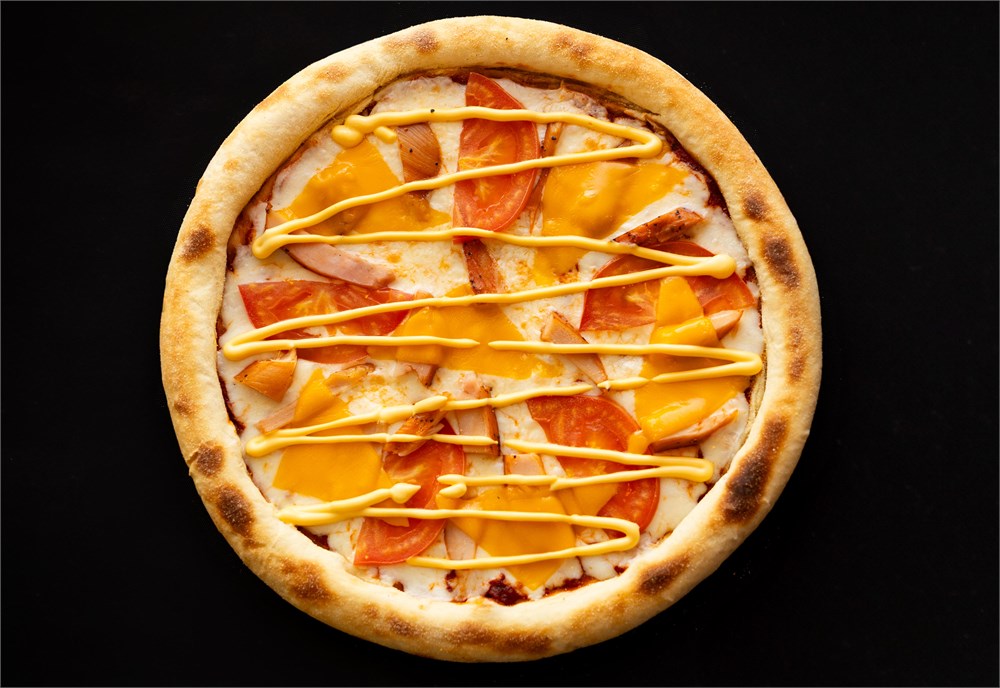 Цыпленок копченый, дорблю, моцарелла, пармизан, томаты, сливочно часночный соус.