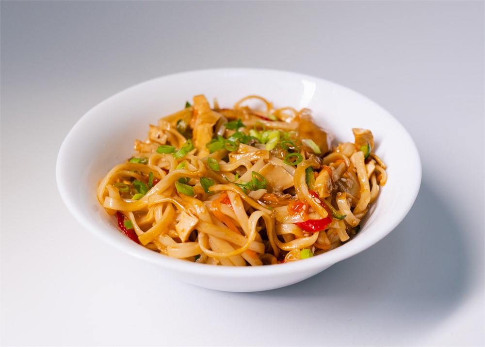 Удон, креветка тигровая, лосось, томаты черри, перец болгарский, огурец, укроп, азиатский соус.