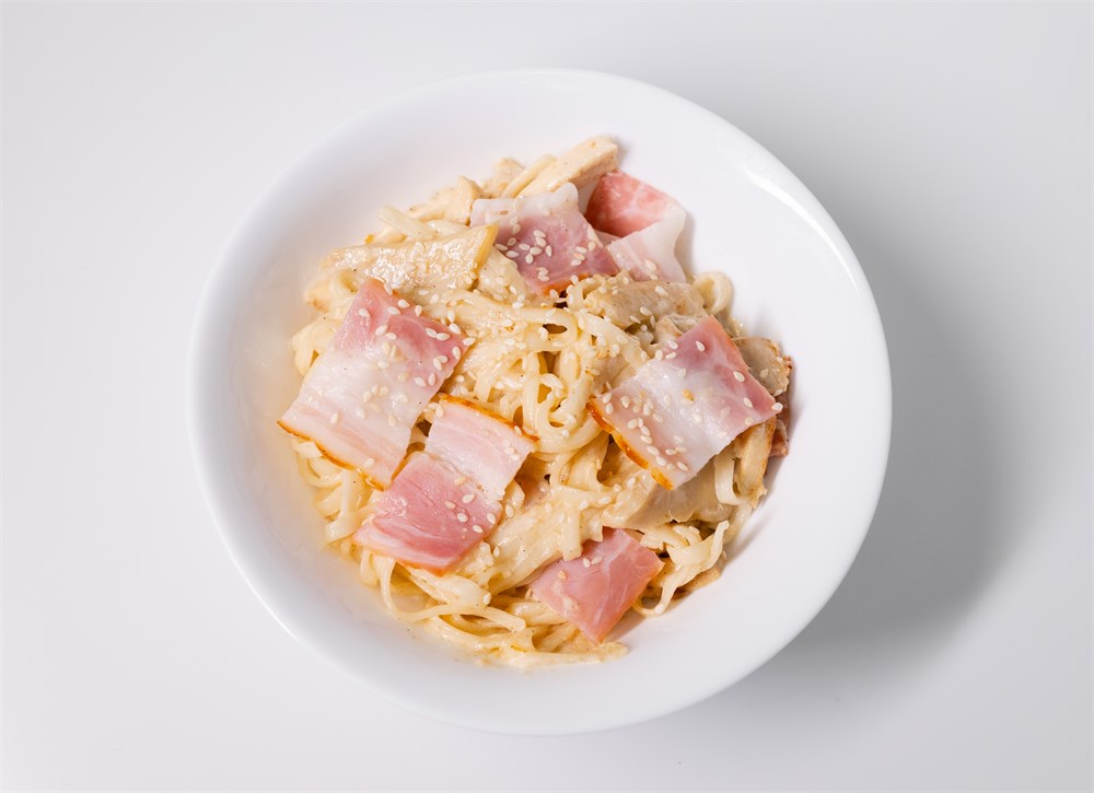 Удон, бекон, цыпленок, чеснок, шампиньоны, кунжут, сливочный соус.