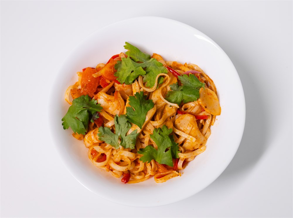 Креветка тигровая, лосось, болгарский перец, огурец, лук репчатый, чеснок, удон, сливочный сыр.