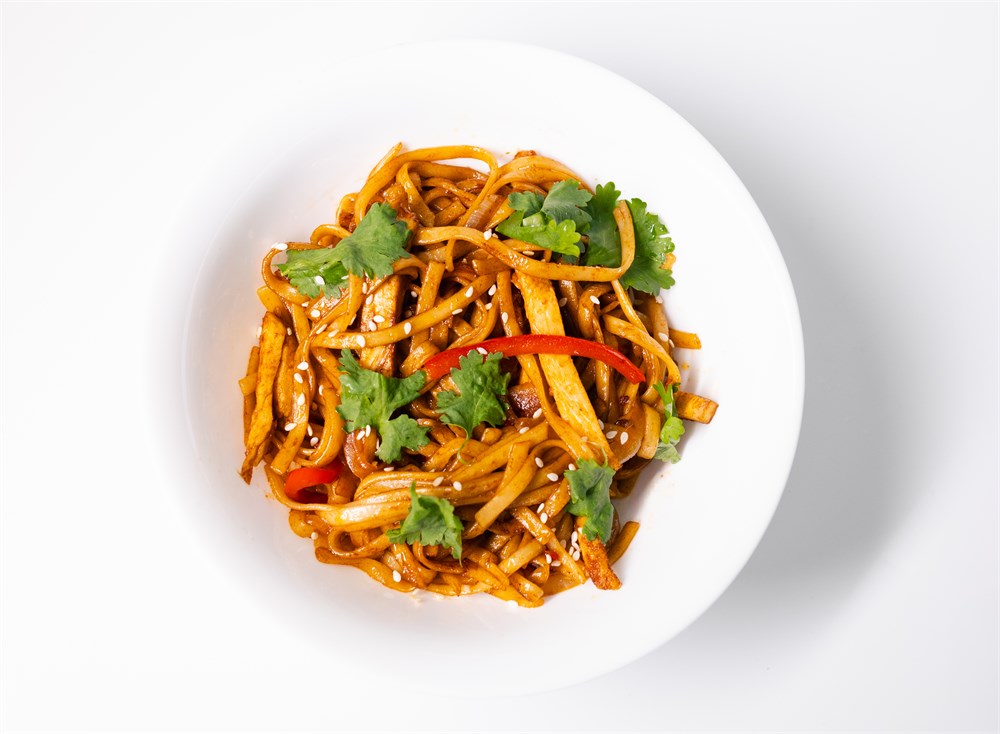 Удон, цыплёнок, фасоль стручковая, морковь, капуста, шампиньоны, перец болгарский, лук репчатый, карри соус.