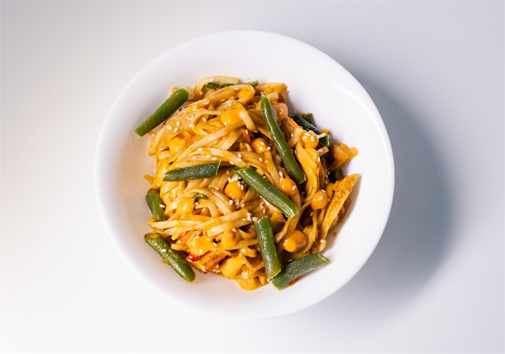 Удон, цыплёнок, фасоль стручковая, морковь, капуста, шампиньоны, перец болгарский, лук репчатый, карри соус.