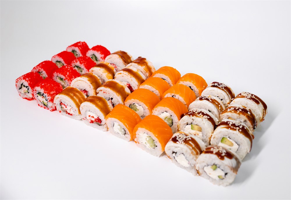 Лосось терияки, филодельфия в масаго, морская делюкс, беби кани, унаги ролл, премиум ролл, тигровый вкус