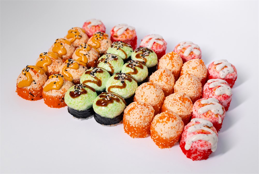 Лосось терияки, филодельфия в масаго, морская делюкс, беби кани, унаги ролл, премиум ролл, тигровый вкус
